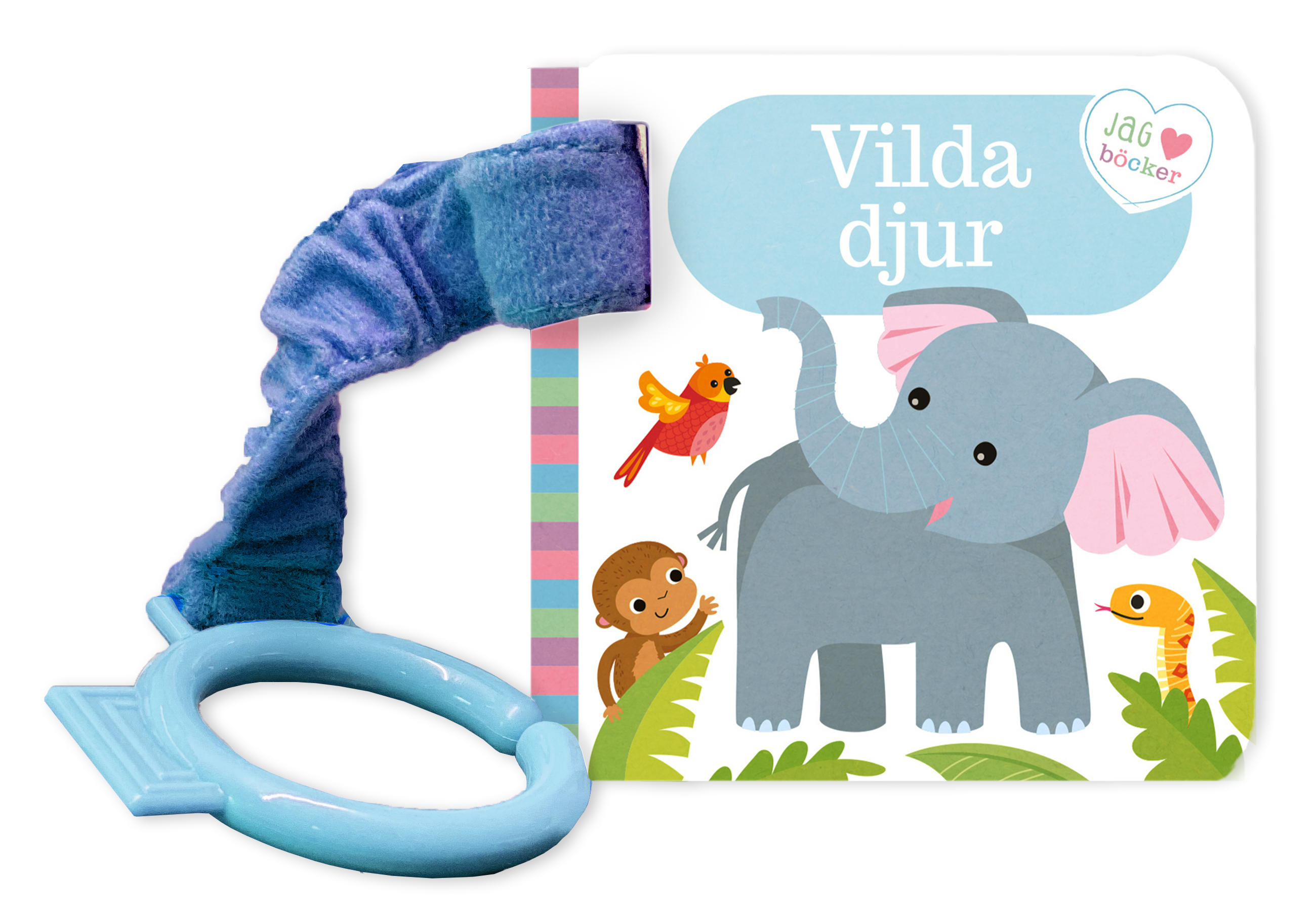 Denna söta bok bjuder på färgstarka och tydliga bilder på vilda djur. Barnet får använda både sin syn och sin känsel genom att se bilderna och klappa och känna elefantens mjuka päls på omslaget. Bandet som följer med gör det möjligt att hänga boken på barnvagnen, så att den alltid är med!