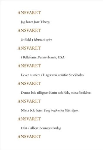 Joar Tibergs nya diktsamling börjar aldrig och slutar heller aldrig, den är ett hjul som rör sig över sidorna, ingenting händer, allt är upp och ner och bak och fram, okänt, eller nykänt, välj själva. Den knyter an till Tibergs stora bok från 2010 Ansvaret Ansvaret Ansvaret Ansvaret. Men där den förra var nedskalad och…