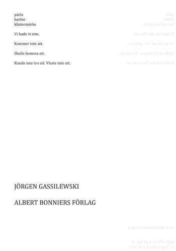 Jörgen Gassilewskis nya bok rör sig över olika fält: det kroppsliga, det filmiska, barnrummet, relationerna mellan det specifika, det generella och det allegoriska. Sekvenser tagna med Iphone blir återgivna i text, den oregerliga kameran som ofta är riktad rakt ner i marken rör sig hastigt och genomkorsar hela tiden…